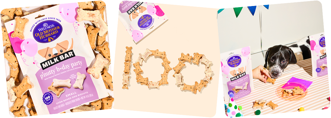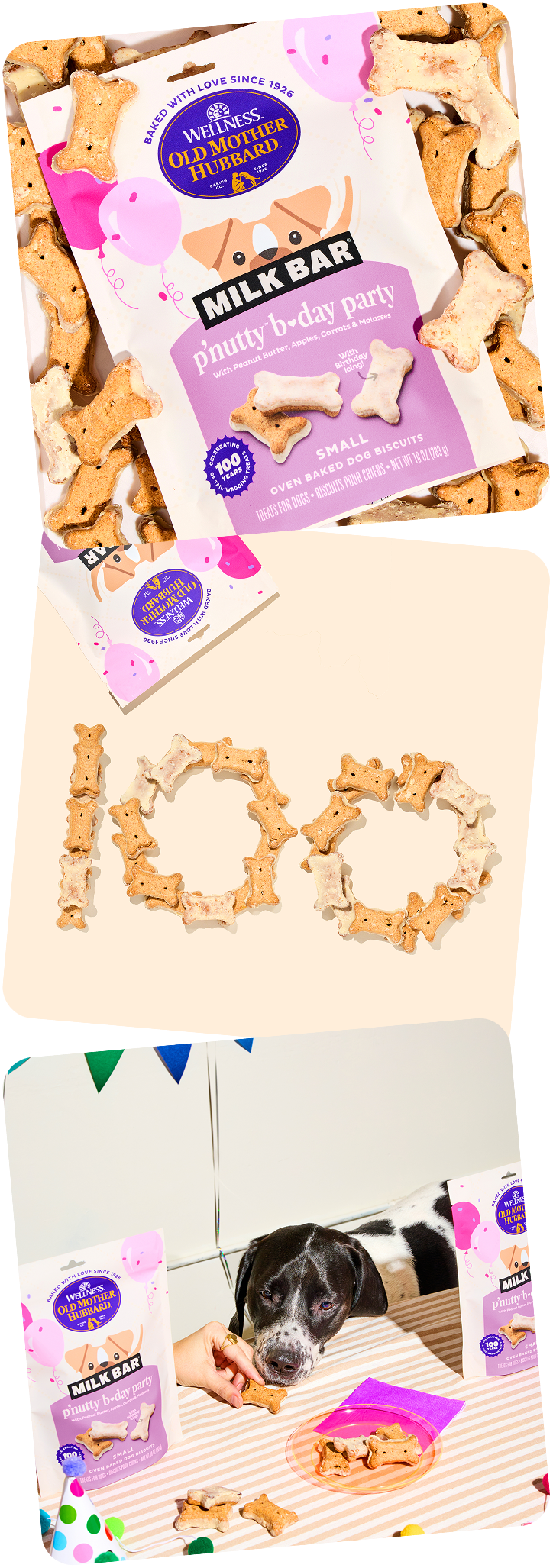To celebrate 100 years of trusted recipes, we’re partnering with Milk Bar® for the ultimate crossover: Wellness Old Mother Hubbard Milk Bar P’Nutty B-Day Party. Our classic P-Nuttier™ crunchy biscuit coated in a vanilla yogurt icing celebrates the joy of life’s moments. From birthdays, gotcha-days, training wins or couch-curl ups, there’s always a tasty reason to share a tail-wagging moment with your best pup.